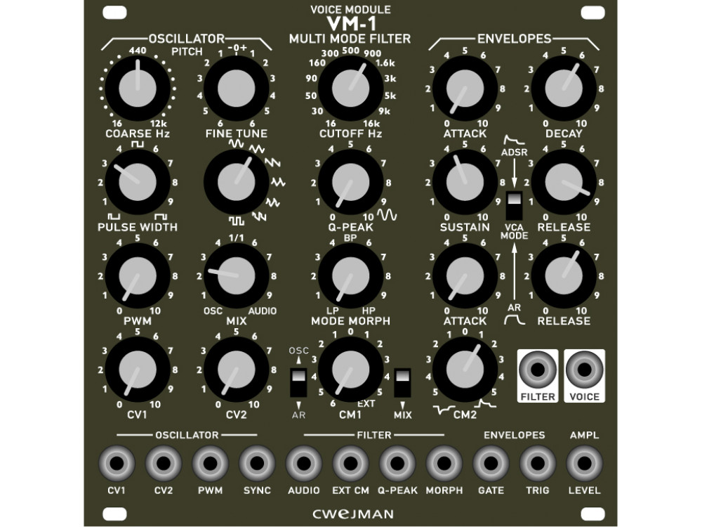 El VM-1 es un módulo de voz completo con un oscilador, filtro de multi-modo, amplificador y dos generadores de envolvente diferentes.