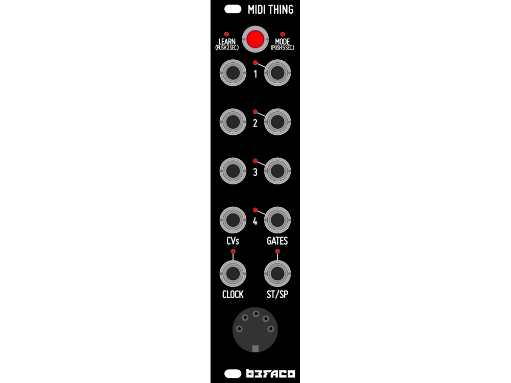 MIDI Thing es una interfaz compacta de 4 canales Midi a CV / Gate con conversión de 12 bits que permite el control V / Oct con una precisión de alrededor de 1 centavo.
