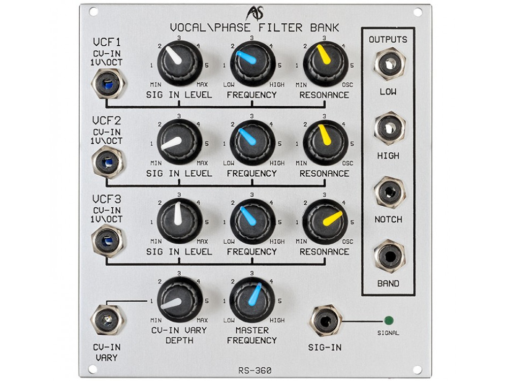 El Filtro RS360 Voz / Fase contiene tres filtros multimodo de resonancia de tensión controlada que se resumen en las salidas. Los filtros de paso bajo y paso alto con una pendiente de -24 dB / octava, mientras que la banda de paso y filtros de corte funcionan con pendiente -12 dB. El módulo es adecuado para crear sonidos y formantes vocales parecidos.