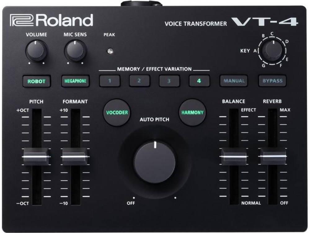 El nuevo VT-4 permite al usuario conectar un micrófono y conseguir rápidamente sonidos vocales únicos con controles diseñados para la interpretación. Incluye armonía, vocoder, cambio de tono, afinación fija, ambiente y otros efectos de gran calidad, ofreciendo al usuario desde un cambio sutil hasta una transformación radical. El VT-4 funciona a pilas y es realmente transportable,