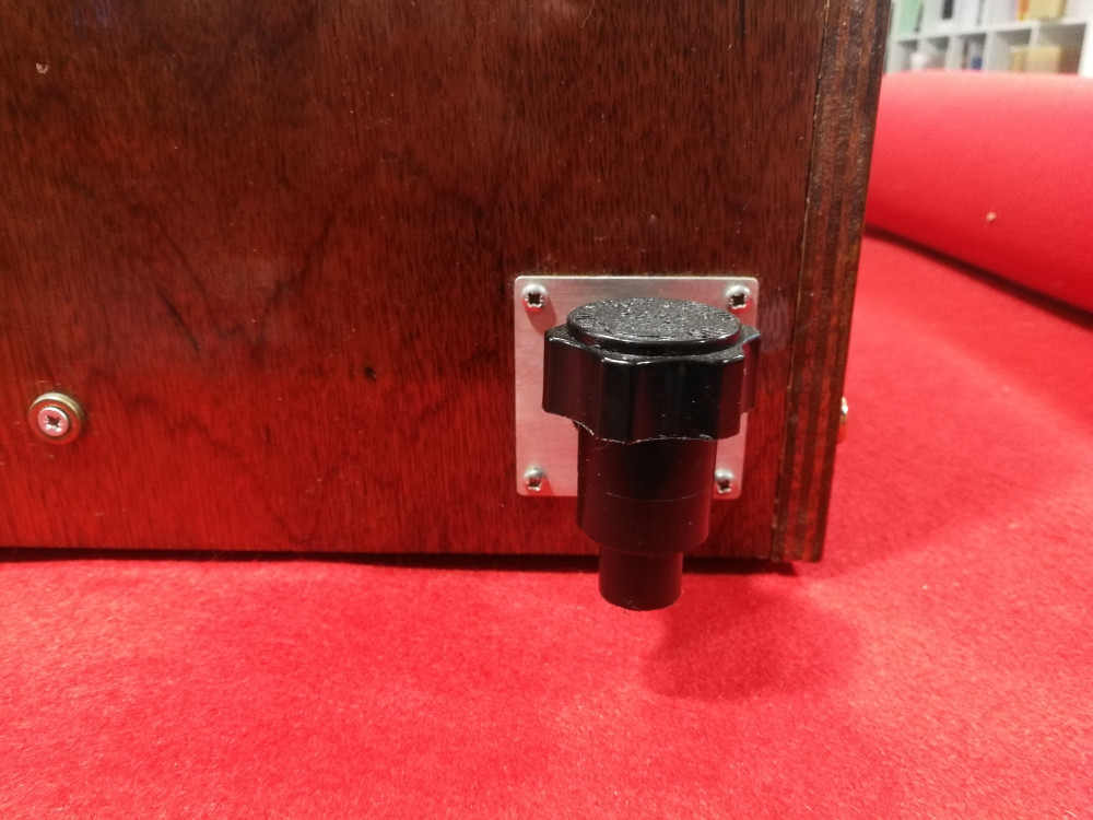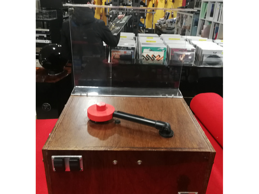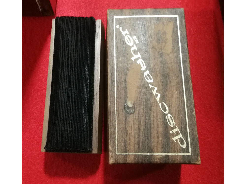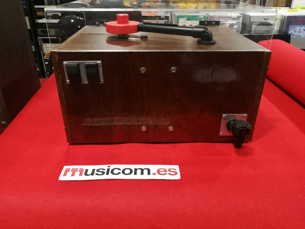Maquina limpiadiscos Moth montada en caja de madera y con tapa de metacrilato.