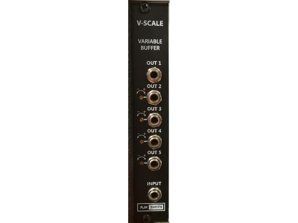 El V-Scale Active Multi es un múltiplo de precisión con búfer con una entrada y cinco salidas. Gracias a la alta impedancia de entrada (20 MOhm), la baja impedancia de salida y una compensación de voltaje CC de menos de 0,003 voltios, este módulo es ideal para dividir señales de control de tono. Cuatro de las cinco salidas estaban equipadas con pequeños potenciómetros de ajuste para permitir ajustes precisos.